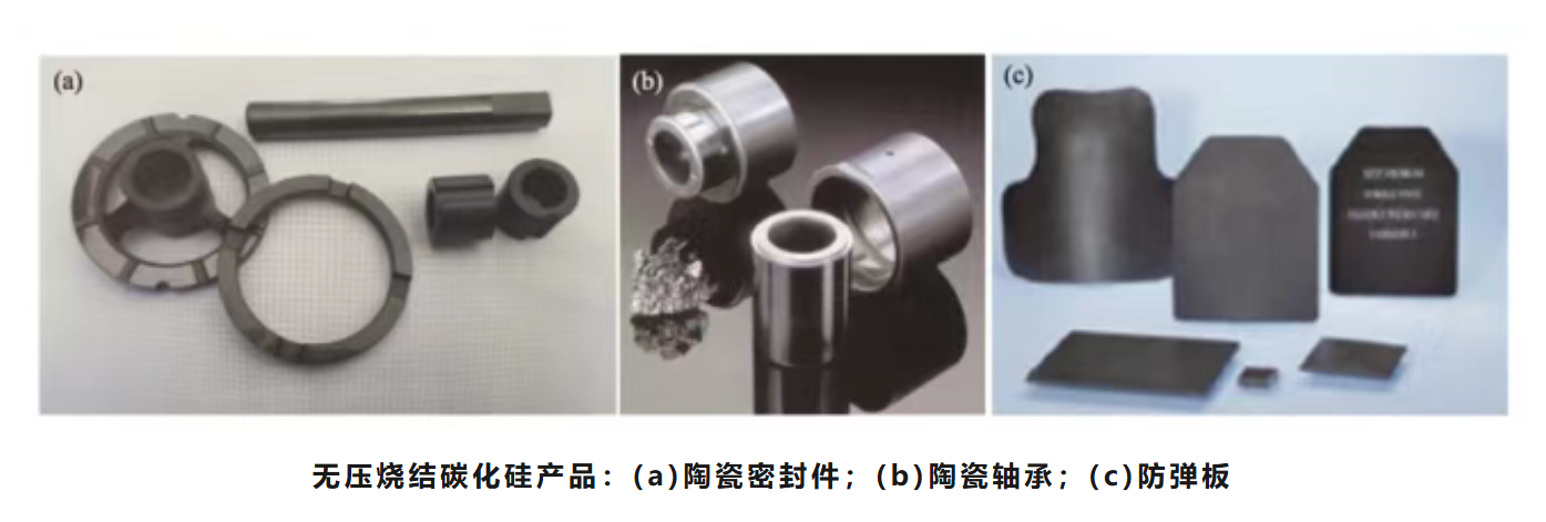 在应用方面,SiC的无压烧结操作简单,成本适中,适用于不同形状的陶瓷零部件的批量化生产,广泛应用于的耐磨损耐腐蚀的密封环、滑动轴承等。此外,无压烧结碳化硅陶瓷因其硬度高、比重小、弹道性能好、破碎后吸收更多能量的能力和价格低廉而被广泛应用于防弹装甲,如车辆和船只的保护,以及民用保险箱和运钞车的保护。作为防弹装甲材料,它具有很好的耐多击性,整体防护效果优于普通碳化硅陶瓷;用于圆柱形陶瓷体轻防护装甲时,其断裂点可达65吨以上,防护效果明显优于使用普通碳化硅陶瓷的圆柱形陶瓷体防护装甲。