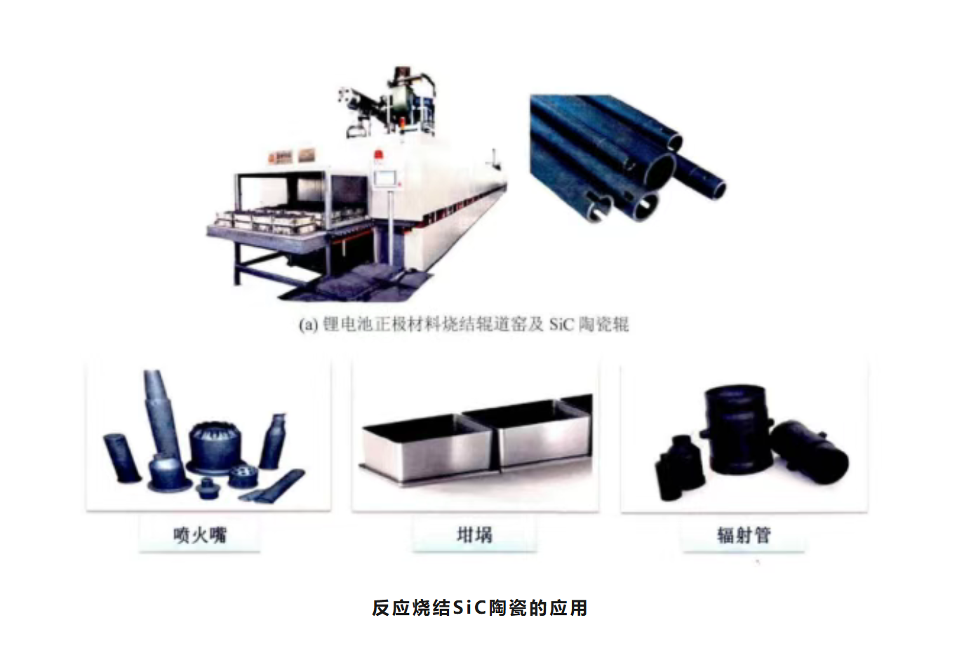 在应用方面,高温窑具材料、辐射管、热交换器、脱硫喷嘴等均是反应烧结碳化硅陶瓷的典型应用。同时,由于碳化硅具有较低的热膨胀系数和较高的弹性模量,以及近净尺寸成型烧结等特点,反应烧结碳化硅也成为空间反射镜的理想材料。此外,随着晶片尺寸和热处理温度的提高,反应烧结碳化硅逐渐取代了石英玻璃。采用高纯的碳化硅粉和高纯硅可以制得包含部分硅相的高纯碳化硅部件,并广泛应用于电子管和半导体晶片制造设备的支撑夹具。
